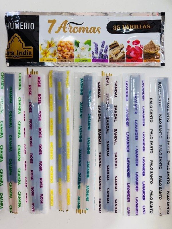 Cada sobre contiene 35 varillas de sahumerios con 7 aromas diferentes: